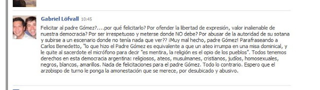 Aparte del serio agravio a la libertad de expresión (y artística) cometido por este cura retrógrado, encima se atrevió a hacer ciertas declaraciones impresionantes a la prensa: el periodista Cristian Molina le preguntó acerca del incidente y el curilla afirmó que «es más grave cuando se violan las convicciones sacerdotales que el abuso de los curas a niños.» Aquí el artículo.