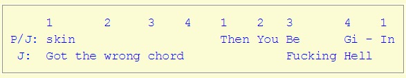 Si se cuenta alto 1-2-3-4 en sincronía con el ritmo a través de esta sección, se obtiene: