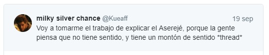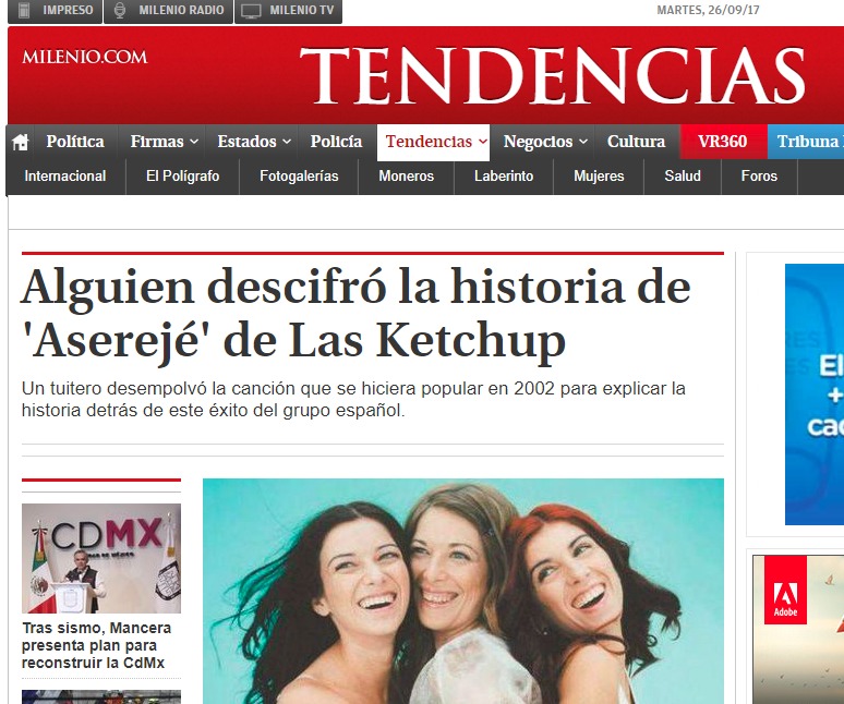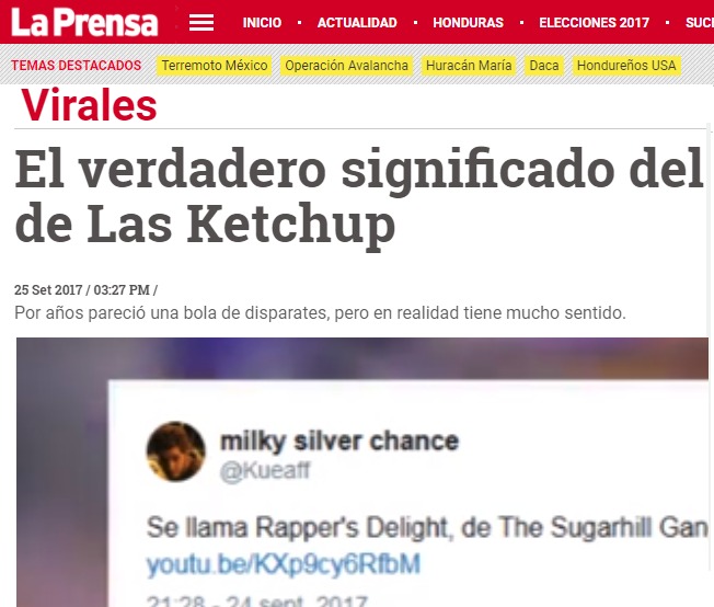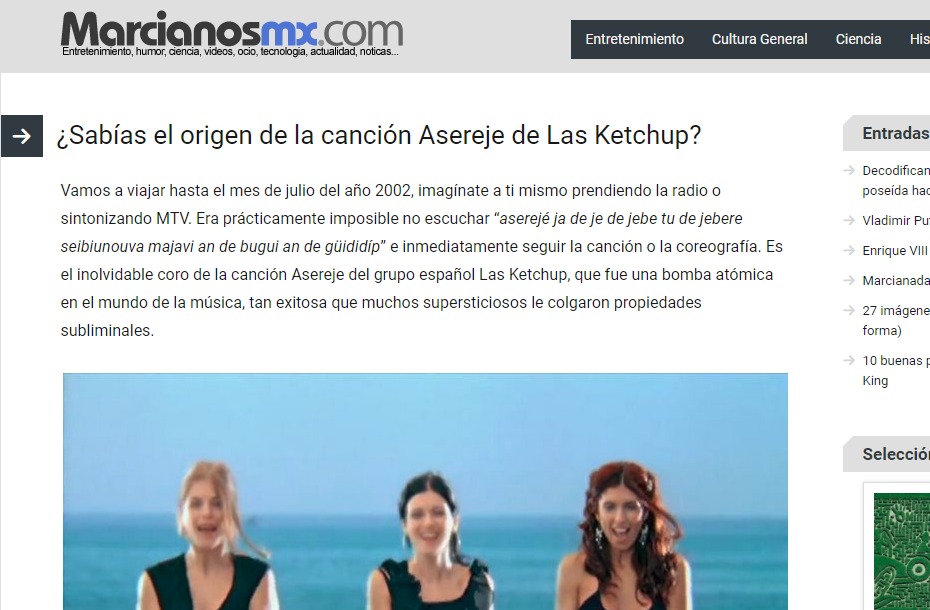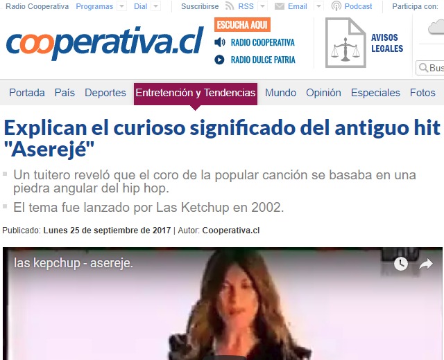 El día de ayer, 25 de septiembre de 2017, el internet y las redes sociales explotaron (figurada y relativamente hablando) con un «impactante descubrimiento» (sarcasmo entre comillas): Por fin alguien había descubierto el misterio del éxito del 2002: el origen del estribillo de la famosísima canción Aserejé, interpretada por Las Ketchup: