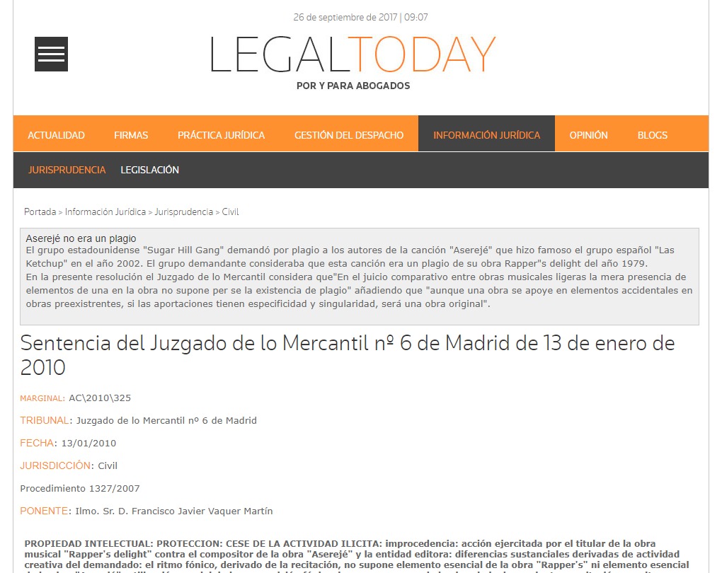 Además, aquí está un artículo de LegalToday que data del 2010, en donde se plasma la demanda de Sugar Hill Gang por el supuesto «plagio» (que no era tal, ni procedió):