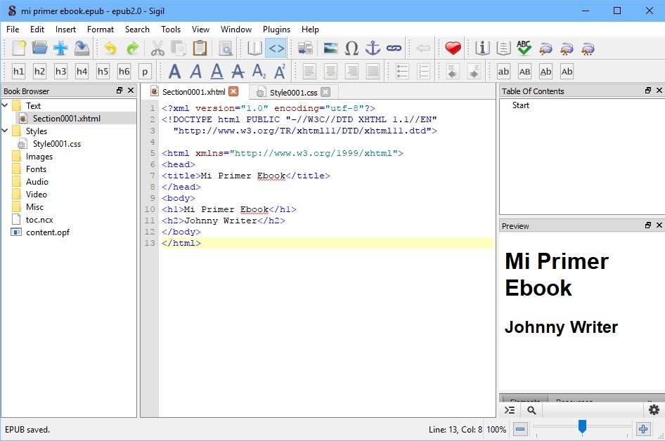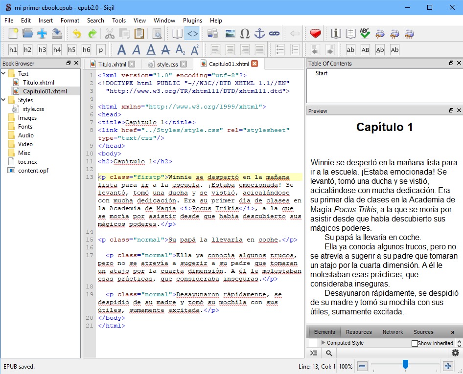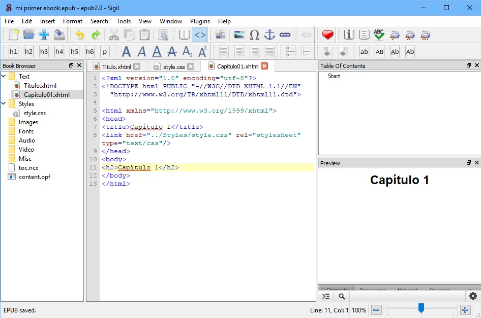 Como podemos ver, ya tenemos el primer capítulo del nuestro libro en ePub. ¿Mencioné ya que hay que guardar siempre? Adelante.