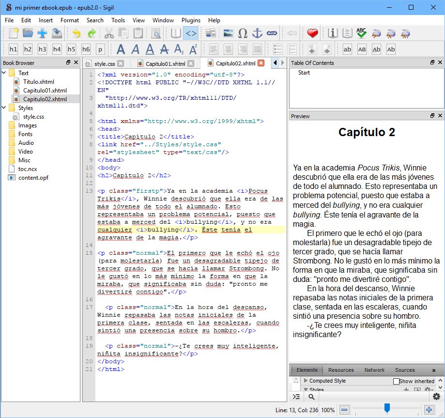 Obviamente, el proceso debe repetirse para cada capítulo. No es gran cosa. Inclusive, podríamos escribir totalmente nuestro libro en Sigil, pero no cuenta con las comodidades de Word o de otros procesadores de texto dedicados, como hacer anotaciones y llevar seguimiento de corrección de errores. Sigil cuenta también con un spell-checker (comprobador de ortografía), pero aún así es más recomendable usar cada herramienta para lo que fue creada.